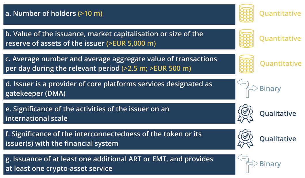 MiCA establishes specific thresholds for the three quantitative criteria and Commission Delegated Regulation (EU) 2024/1506 (link) specifies the indicators to be considered for the two qualitative criteria.