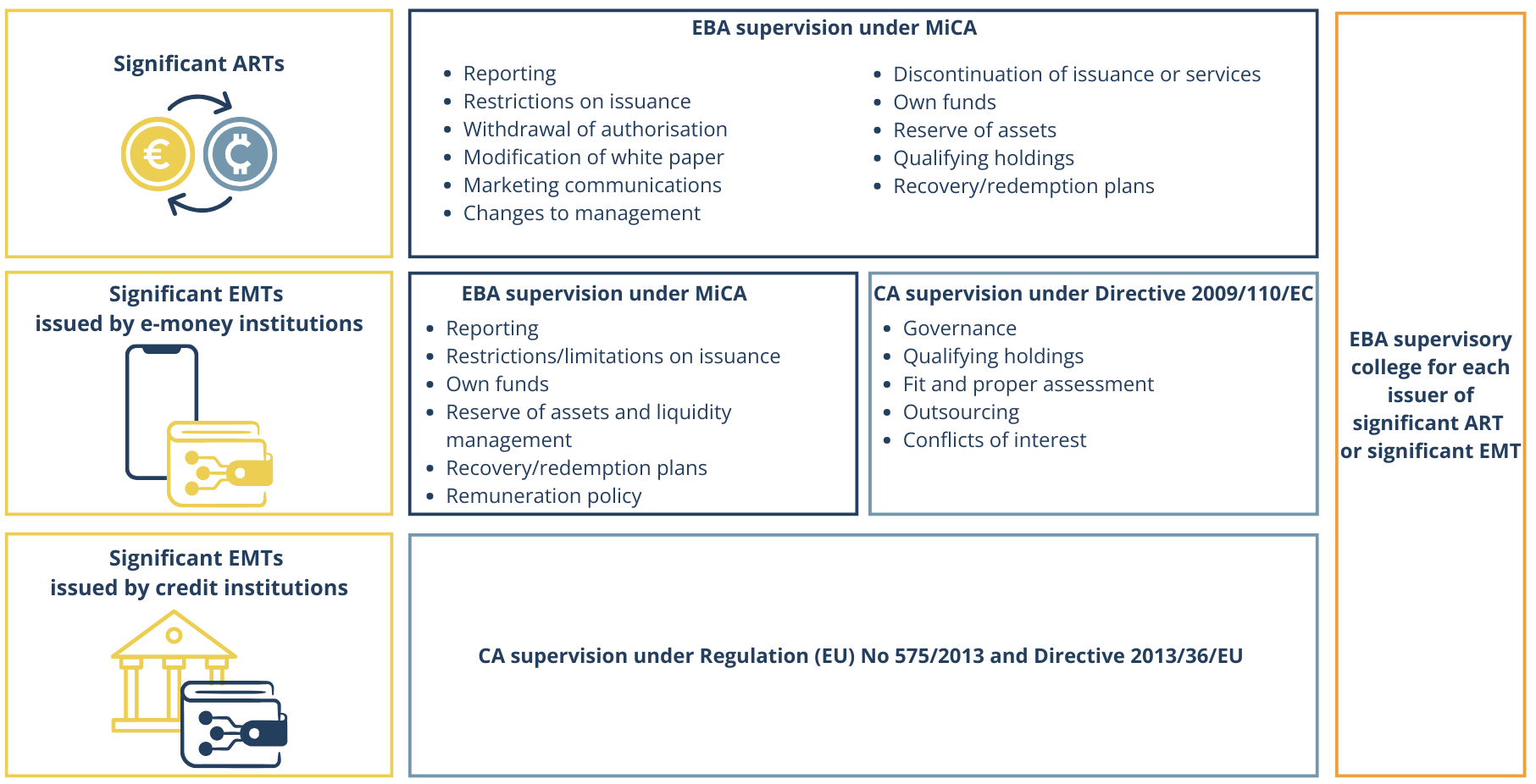 - Supervisory colleges: for each issuer of significant ART and EMT, the EBA establishes, manages and chairs a supervisory college. Supervisory colleges facilitate the cooperation and exchange of information among their members and issue non-binding opinions on specific matters set out in MiCA.