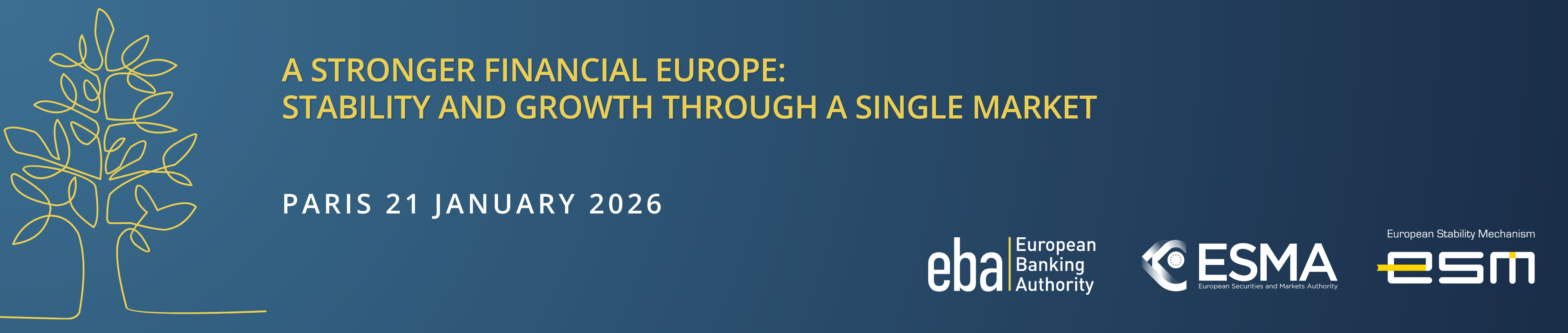A Stronger Financial Europe: Stability and Growth Through a Single Market Conference/Workshop 21/01/2026 - 10:00 - 21/01/2026 - 11:30 The event will feature three leading voices in European financial supervision and financial stability, José Manuel Campa (Chairperson of the EBA), Verena Ross (Chair, of ESMA) and Pierre Gramegna (Managing Director, ESM). They will share their perspectives on strengthening the EU Single Market for Financial Services and discuss how enhanced collaboration can support stability and growth across Europe.Event informationEvent format & attendance: in-person at the EBA premises and remotely via conference call.The event will be recorded and representatives from press and media will be present.