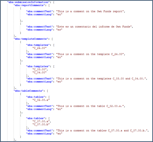 - The draft specifications for this approach envisage a dedicated root object (eba:submissionInformation) to host structured metadata about the submission. Within this object, reporting entities could provide information structured in various JSON elements: