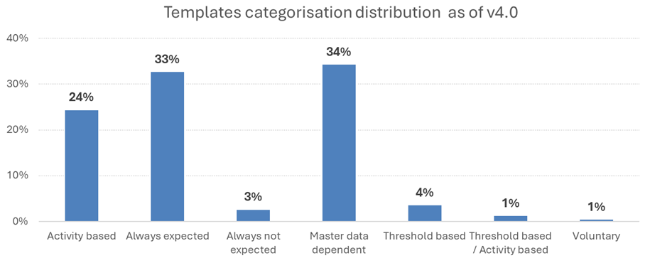 The EBA supervisory reporting framework has around 220 reporting templates of which 33% are always expected to be reported while the remaining templates are subject to different criteria to trigger the reporting obligation. These templates are reported for activities banks are carrying out (e.g. only banks have securitised assets, issuing covered bonds or certain type of hedging), applicable to banks with advanced approaches (e.g. IRB, IM) or certain size category (SNCI, other, large) or based on thresholds (e.g. foreign exposures, high NPLs).