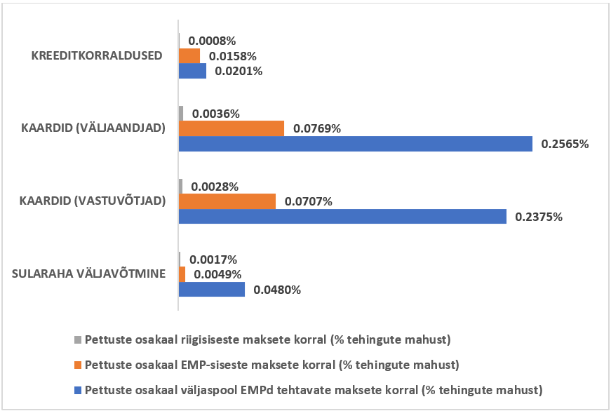Joonis 10. Petturlike tehingute osakaal (tehingute kogumahust), kui makseid tehakse riigis, EMPs ja väljaspool EMPd