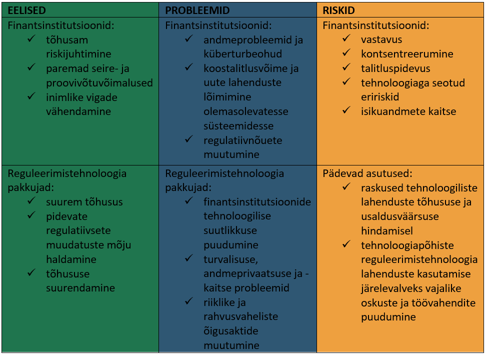 Joonis 13. Peamised eelised, probleemid ja riskid reguleerimistehnoloogia lahenduste kasutamisel
