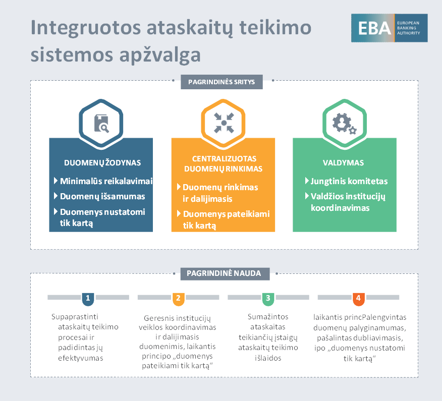 2021 m. EBI baigė rengti galimybių studiją dėl nuoseklios ir integruotos statistinių, pertvarkymo ir prudencinių duomenų rinkimo sistemos. Šios studijos ataskaitoje pateikiama ilgalaikė vizija, kokia galėtų būti integruota duomenų teikimo sistema. Joje taip pat pabrėžiama, kaip racionalizuoti ir patobulinti duomenų teikimo procesus tiek įstaigoms, tiek kompetentingoms institucijoms ir kaip sustiprinti institucijų bendradarbiavimą prudencinių, pertvarkymo ir statistinių duomenų teikimo srityse.
