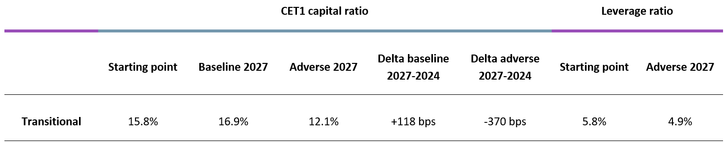 - The capital depletion under the adverse stress test scenario amounts to 370 bps, resulting in a CET1 ratio at the end of the scenario of 12%[2]. The strong income generation during the exercise helps banks to partly offset their losses and results in a lower depletion compared to the 2023 exercise.