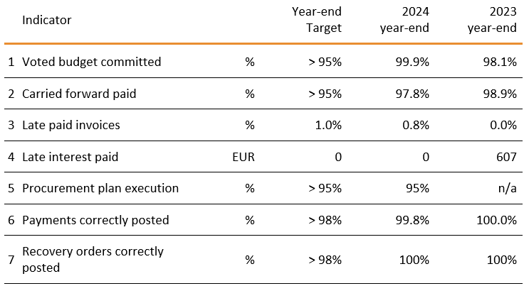 - Late paid invoices: number of invoices paid by the EBA after the payment deadline, as a percentage of all invoices paid in the year to date. With the expected volume of invoices in 2024, 1% represents less than 10 invoices.