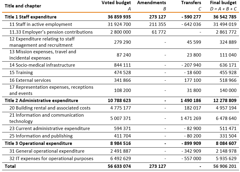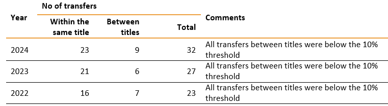 In 2024, the EBA processed 32 budget transfers, of which nine included transfers between titles. All of the transfers between titles were below the 10% threshold that would have required MB approval.