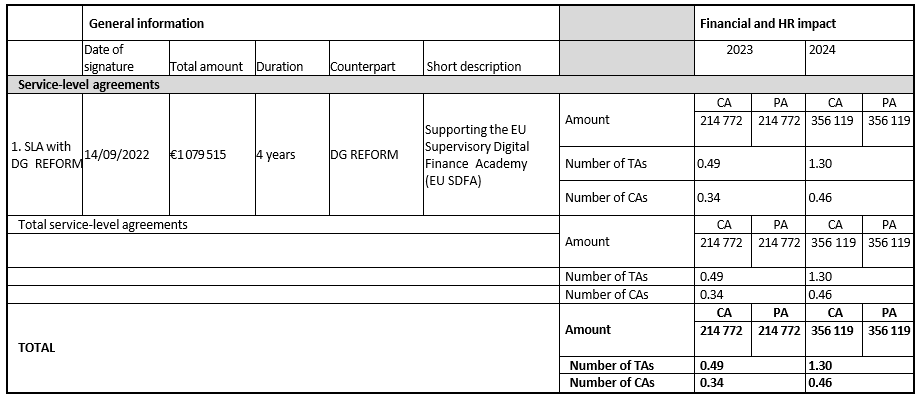In 2022, the EBA signed an SLA with DG REFORM whereby the EBA provides services to the EU Supervisory Digital Finance Academy (https://eusdfa.eui.eu) over a period of four years. Under the terms of this SLA, DG REFORM is funding one TA and one CA for three years, as well as other costs arising from the EBA’s support to the EU SDFA.