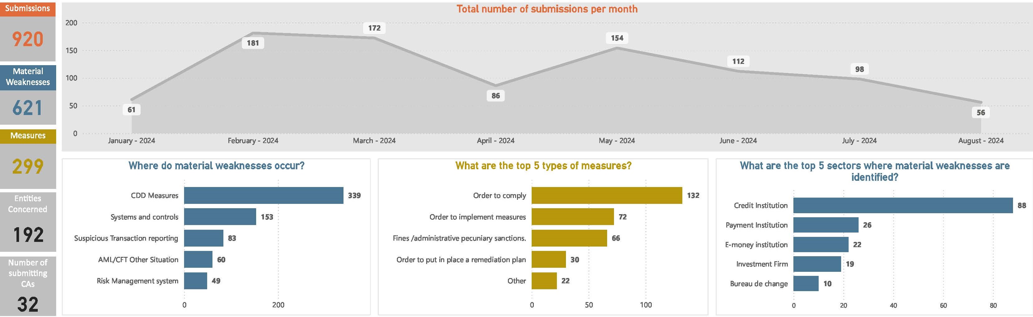 From 1 January 2024 to 31 August 2024, 32 national competent authorities reported to EuReCA, the EU’s central database for AML/CFT[5], more than 600 serious deficiencies, or ‘material weaknesses’, that they had detected in a high number of financial institutions exposing them to ML/TF risks. As has been the trend to date, most reports concerned credit institutions, alongside payment, and followed by an increase of deficiencies detected in e-money institutions, compared to the previous report. This reflects the high ML/TF risk EU competent authorities identified within these sectors. Most deficiencies reported in this period were still related to institutions’ approaches to CDD. Most of the measures reported were designed to correct these deficiencies through orders to comply, followed by an increase in orders to implement measures, and fines/administrative pecuniary sanctions (which represents an inverted trend compared to the previous report) (Figure 70). The EBA also started collecting information on natural persons directly associated with ML/TF material weaknesses in May 2024.