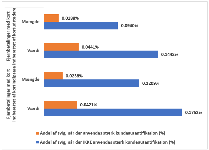 Andre iagttagelser tyder på, at de reguleringsmæssige krav til betalingssikkerhed samlet set har den ønskede virkning. De svigagtige betalingers andel af den samlede mængde og værdi af alle betalinger er f.eks. betydeligt lavere for transaktioner, der er autentificeret med stærk kundeautentifikation, end dem, der ikke er.