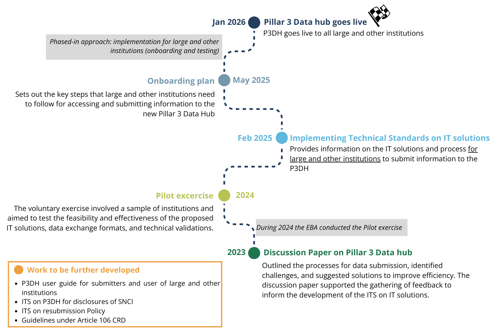 The first implementation of the P3DH will solely consider large and other institutions required to disclose Pillar 3 information under the CRR provisions. Institutions disclosing Pillar 3 information on a purely voluntary basis will not be considered at this stage. Following the first implementation, the EBA will reassess how these specific cases could be treated and whether the respective disclosures could be done via the P3DH.
