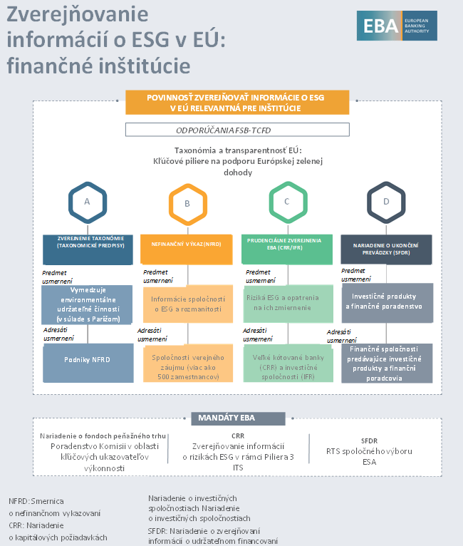 Cieľom EBA je podporiť inštitúcie pri plnení ich povinností zverejňovania informácií a uľahčiť zainteresovaným stranám prístup k porovnateľným informáciám o úverových a investičných činnostiach, ktoré sú vystavené rizikám súvisiacim s ESG, a zároveň im umožniť porovnávať výsledky inštitúcií v oblasti udržateľnosti. Na tento účel EBA prispel k vymedzeniu noriem zverejňovania informácií o udržateľnosti svojimi technickými predpismi pre zverejňovanie informácií o rizikách ESG v rámci 3. piliera.