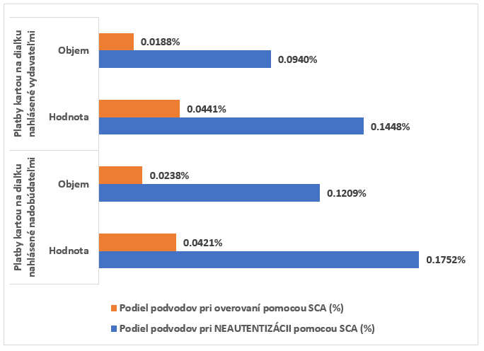 Obrázok 11: Podiel podvodných transakcií (z hľadiska objemu a hodnoty celkových transakcií) pri platbách kartou na diaľku, ktoré nahlásili vydavatelia a nadobúdatelia, s SCA a bez SCA